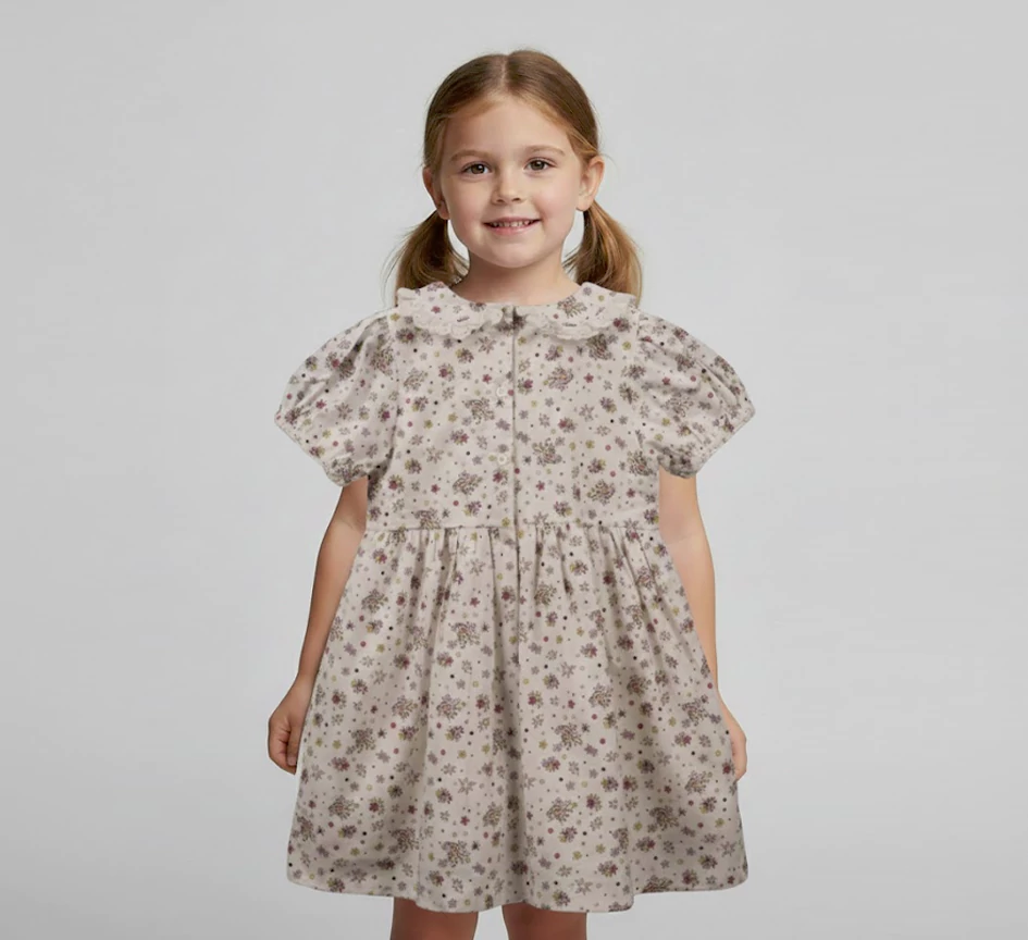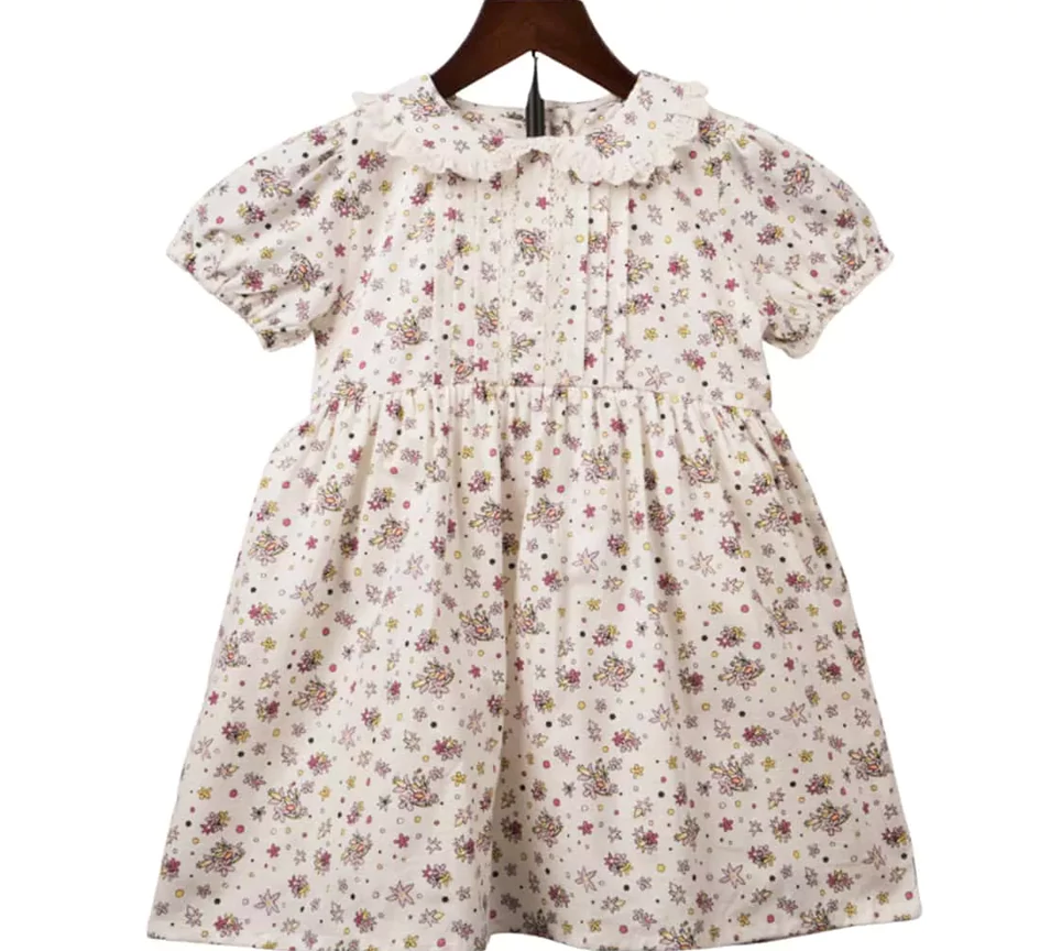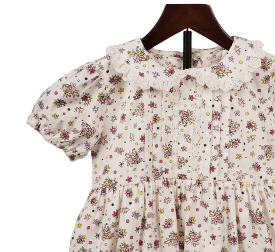 A staple for her classic wardrobe. This charming frock is made from soft, light fabric and features a delicate all-over flower print. The signature Peter Pan collar with a ruffle trim gives it an instantly recognizable, sweet look. Designed with comfort in mind, the easy-fit bodice, gathered short sleeves, and relaxed skirt allow for freedom of movement during play. A perfect blend of style and practicality.