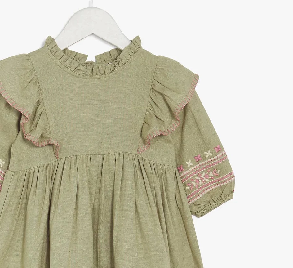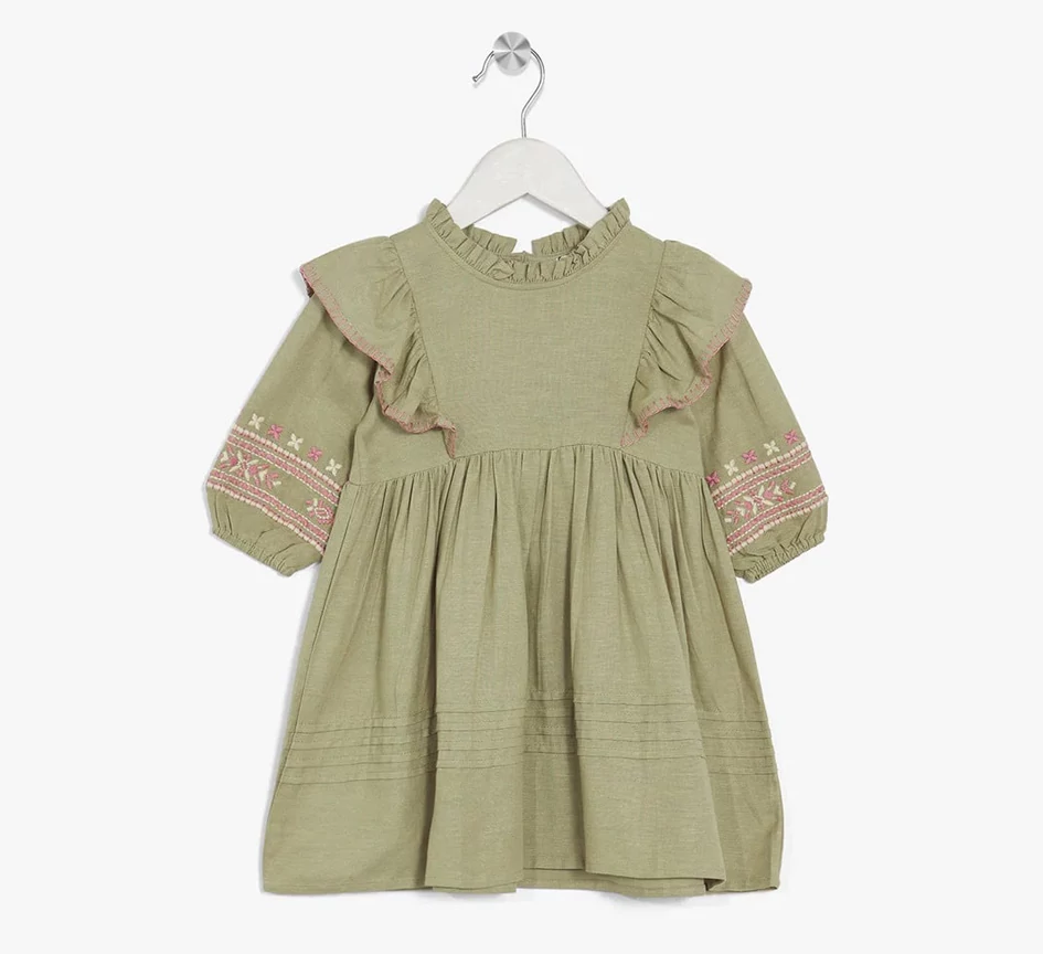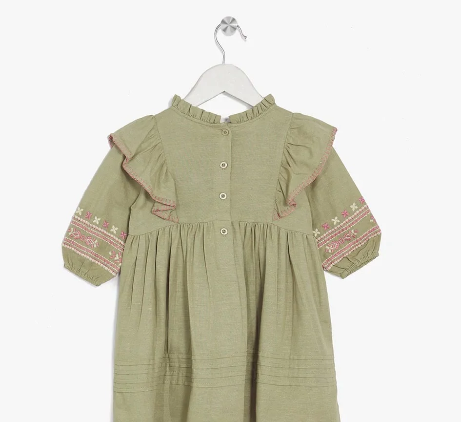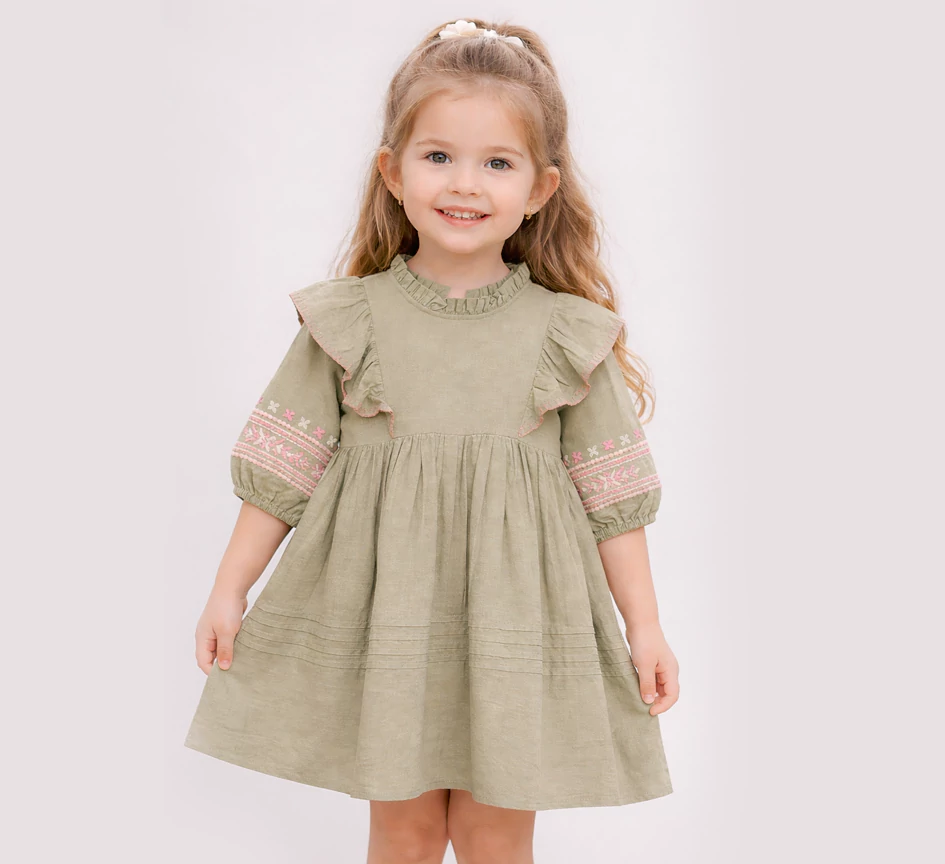 Introduce a touch of timeless charm to her wardrobe with our Embroidered Ruffle Dress in a beautiful, muted Olive Green. This dress blends a comfortable silhouette with delicate, artisanal details.