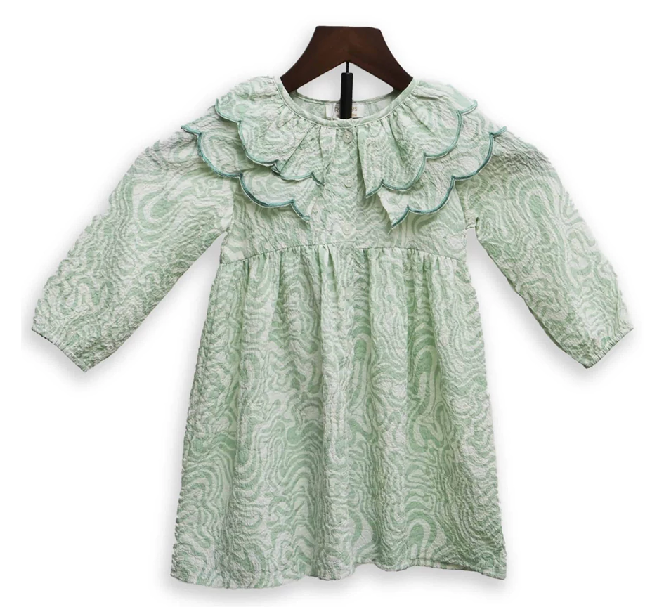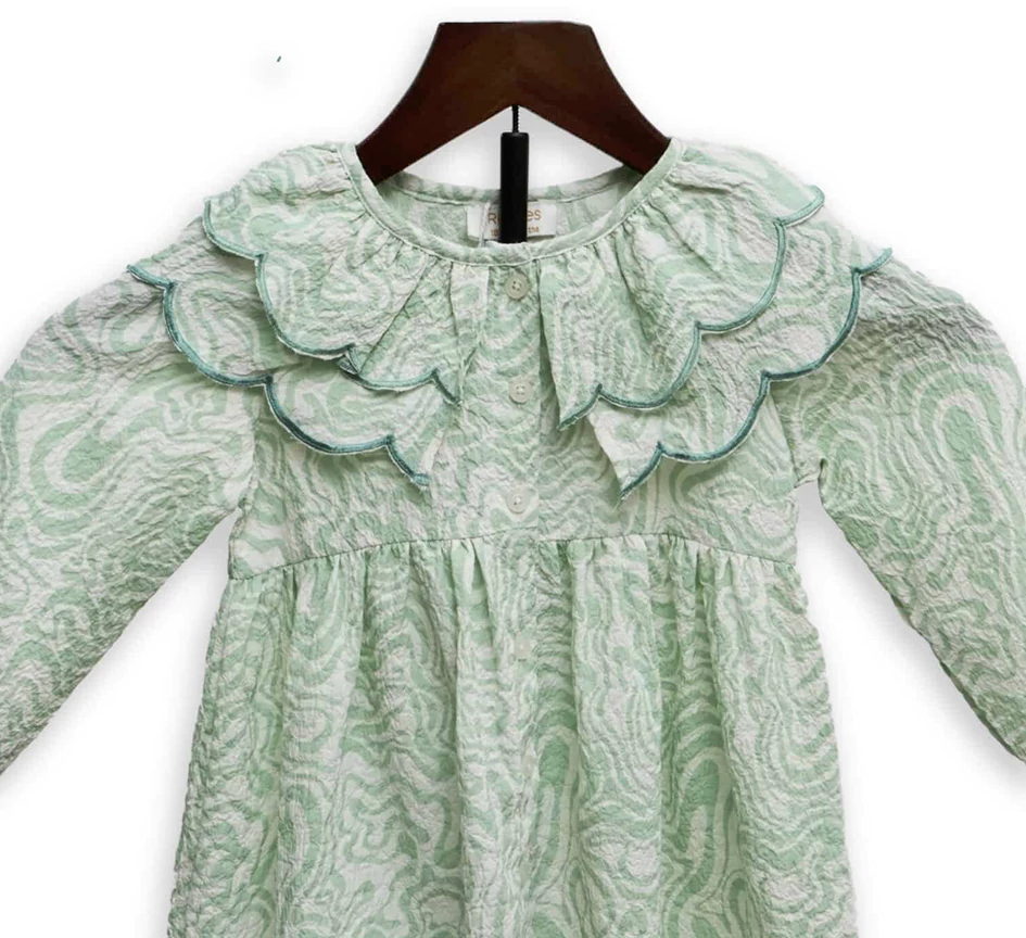 Elegant, fresh, and oh-so-pretty — this mint green dress is perfect for your little fashionista! Designed with an all-over paisley pattern and layered ruffle detailing on the neckline, it brings a touch of charm and sophistication to any occasion. The long sleeves make it ideal for cooler days, while the soft, breathable fabric ensures all-day comfort.
