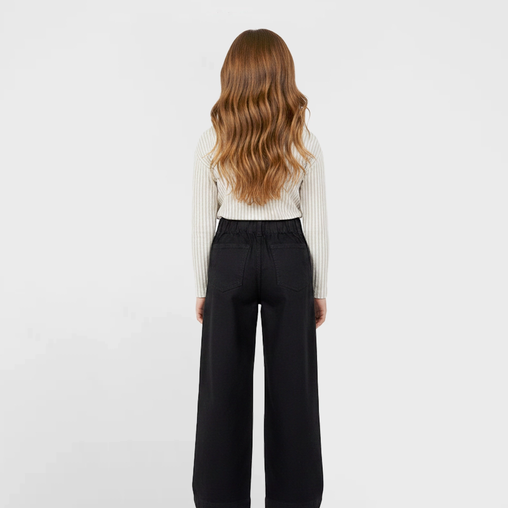 These classic wide-leg jeans are a wardrobe essential for everyday styling. Crafted from soft yet durable twill fabric, they offer a comfortable fit with a structured look. The elasticated waistband with a button detail ensures ease of wear, while functional side pockets add practicality. Finished in a timeless black shade, these jeans are easy to dress up or down—perfect for school days, outings, or casual occasions.