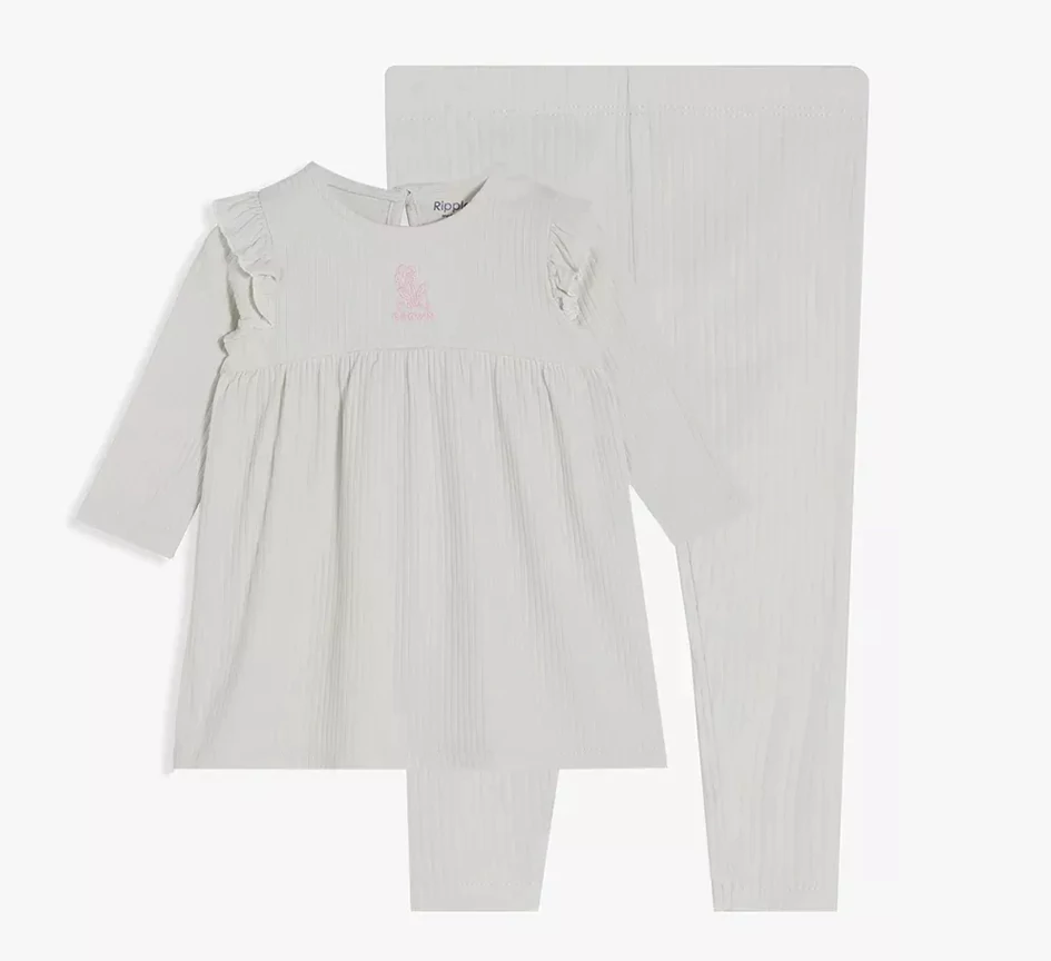The matching ribbed leggings offer a snug yet gentle fit, allowing easy movement for play, cuddles, and naps. Perfect for lounging at home or stepping out in style, this timeless set is a must-have for your baby’s wardrobe.