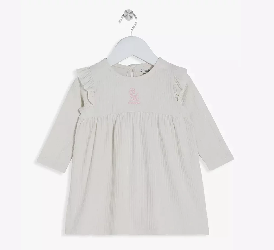 Wrap your little one in everyday comfort with our Home Grown ribbed two-piece set. Crafted from a soft, breathable fabric, this off-white outfit features a long-sleeve top with delicate ruffle shoulder detailing and a subtle vertical ribbed texture. Finished with a sweet embroidered floral motif and “home grown” text on the chest, it’s designed for effortless style and all-day comfort.