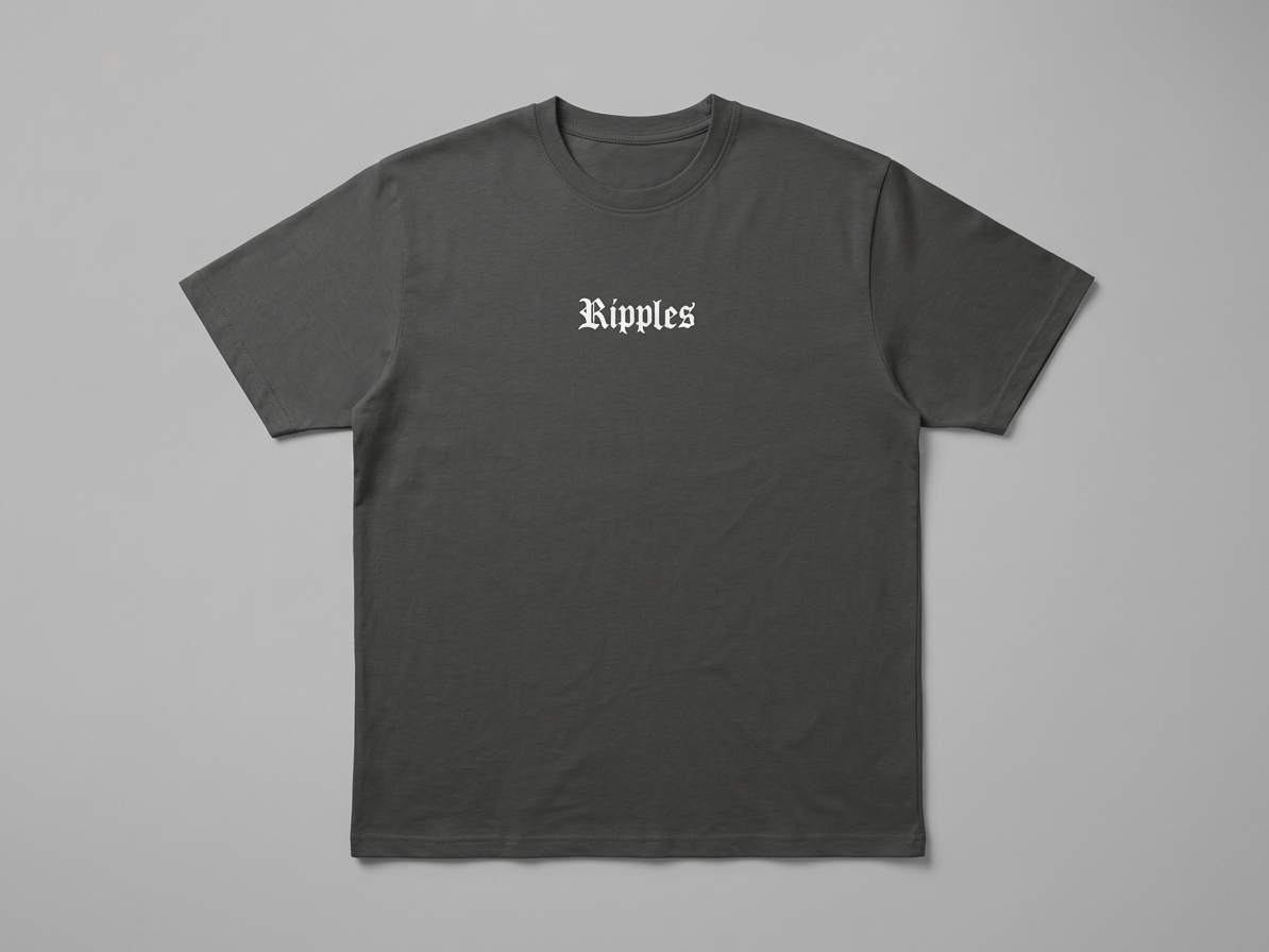 Elevate your essentials with the “Ripples” graphic tee. This shirt features a minimalist yet bold design with “Ripples” printed in a classic gothic-style font centered on the chest. The muted slate-grey color provides a sophisticated backdrop, making it an easy-to-style piece for any casual or streetwear look.