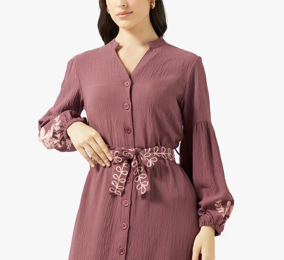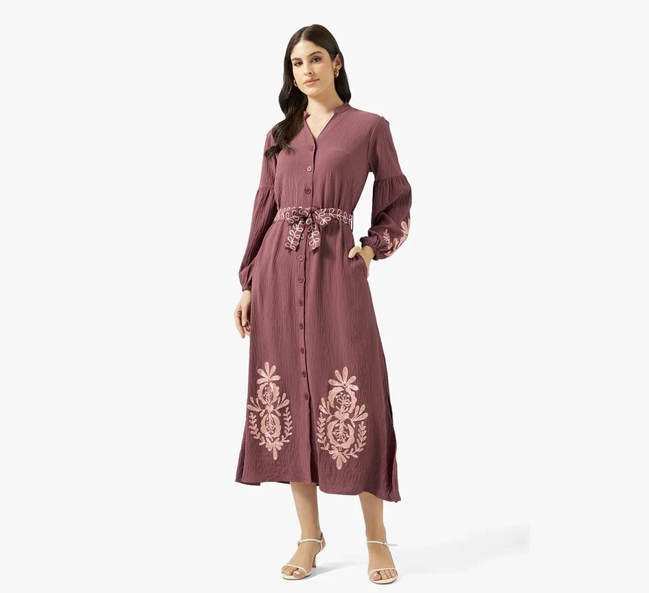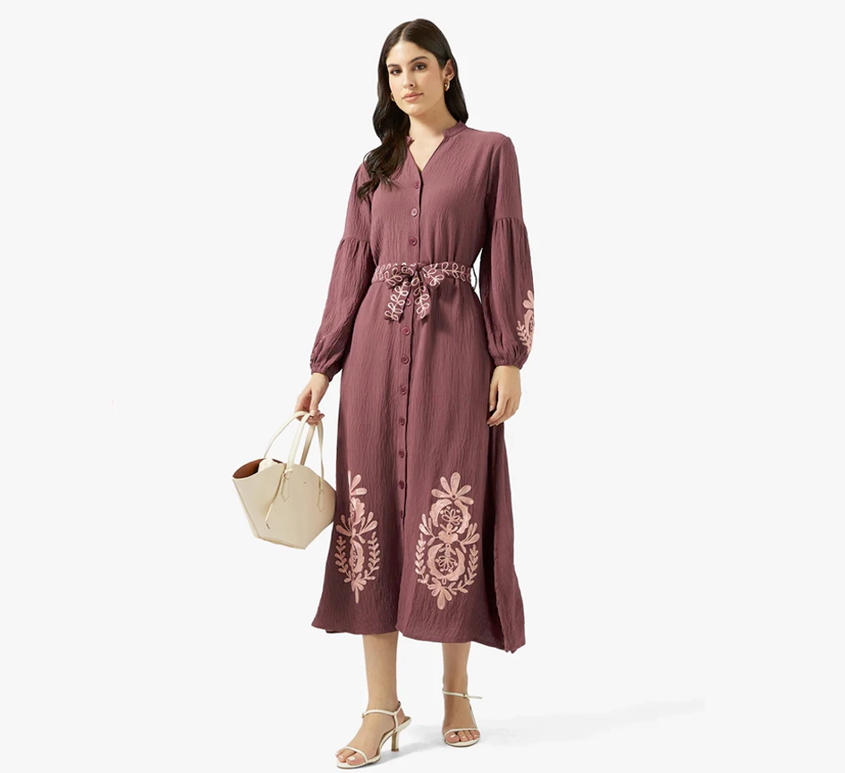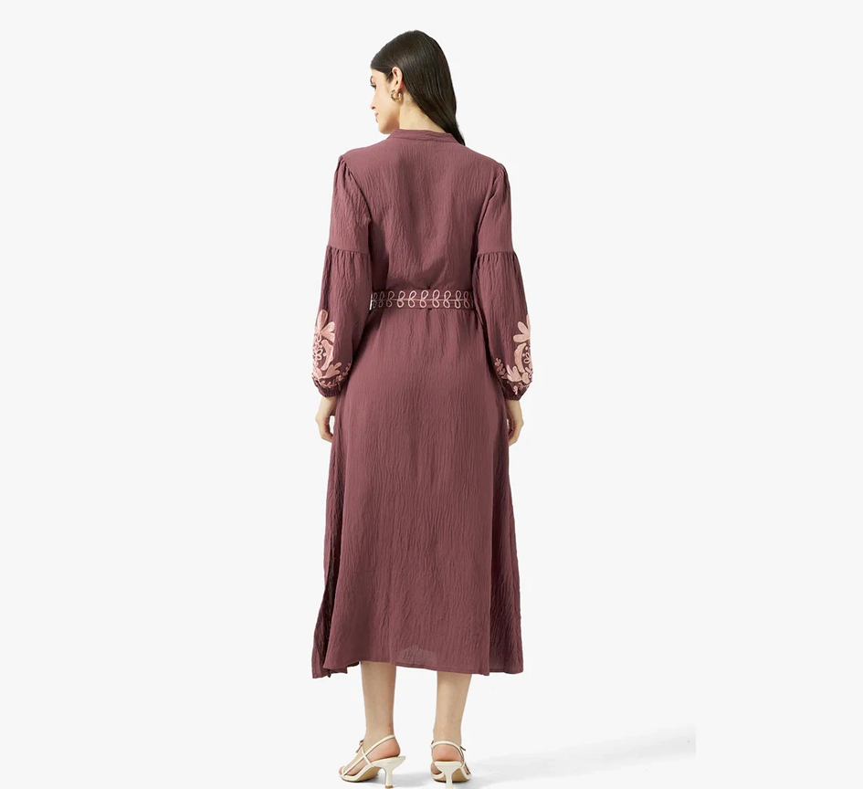 Make a statement in this exquisite long dress, combining a deep, rich hue with stunning ornate detailing for an unforgettable look.