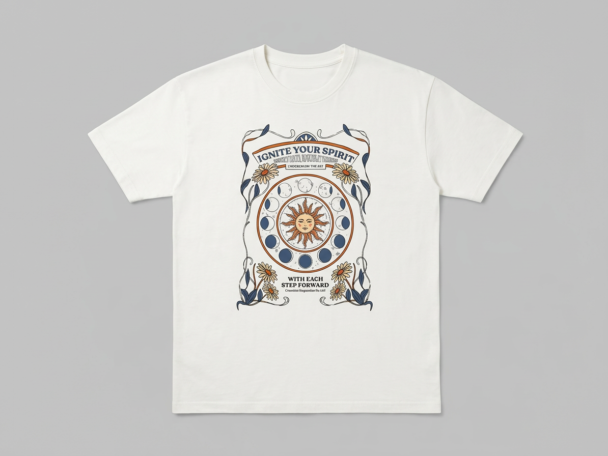 Channel a mystical, bohemian energy with the “Ignite Your Spirit” Celestial Graphic Tee. Crafted from 100% cotton, this cream-colored essential combines a premium, soft-touch feel with an intricate design, making it a perfect standout piece for any casual wardrobe.